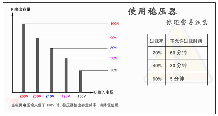 1、當(dāng)電網(wǎng)電壓輸入低于198V時(shí),穩(wěn)壓器輸出容量減半,需降低使用;